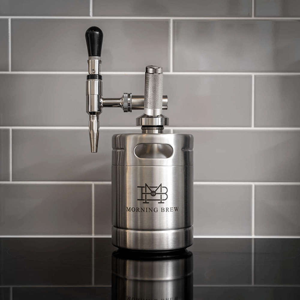 My Morning Brew is a home brewing kit that lets you make your own nitro coffee from the convenience of your home. The kit includes a mini steel keg, stainless steel spear with pressure relief valve, stainless steel stout faucet, tap handle, N2O cartridge holder, and cleaning brush.